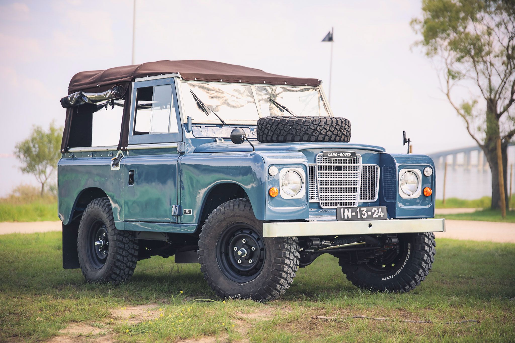 From our friends at Landsquare in Lisbon! Finished in the classic shade of French Blue, this Land Rover has had a full, frame off restoration. The chassis and frame have been meticulously reworked to guarantee a reliable, rust free body. The seats have been reupholstered in a beautiful dark brown, quilted leather. The dash is wrapped in a matching leather, featuring a rebuilt cluster and an aftermarket radio. The soft, zip top has been custom made to match the interior. The car also comes with a custom button-style cover if you decide to remove the upper frame and keep the truck low profile. A preferred style for trucks kept at the beach or lake house. The engine is a ground up rebuild of the original. Completely OEM with 90k miles.